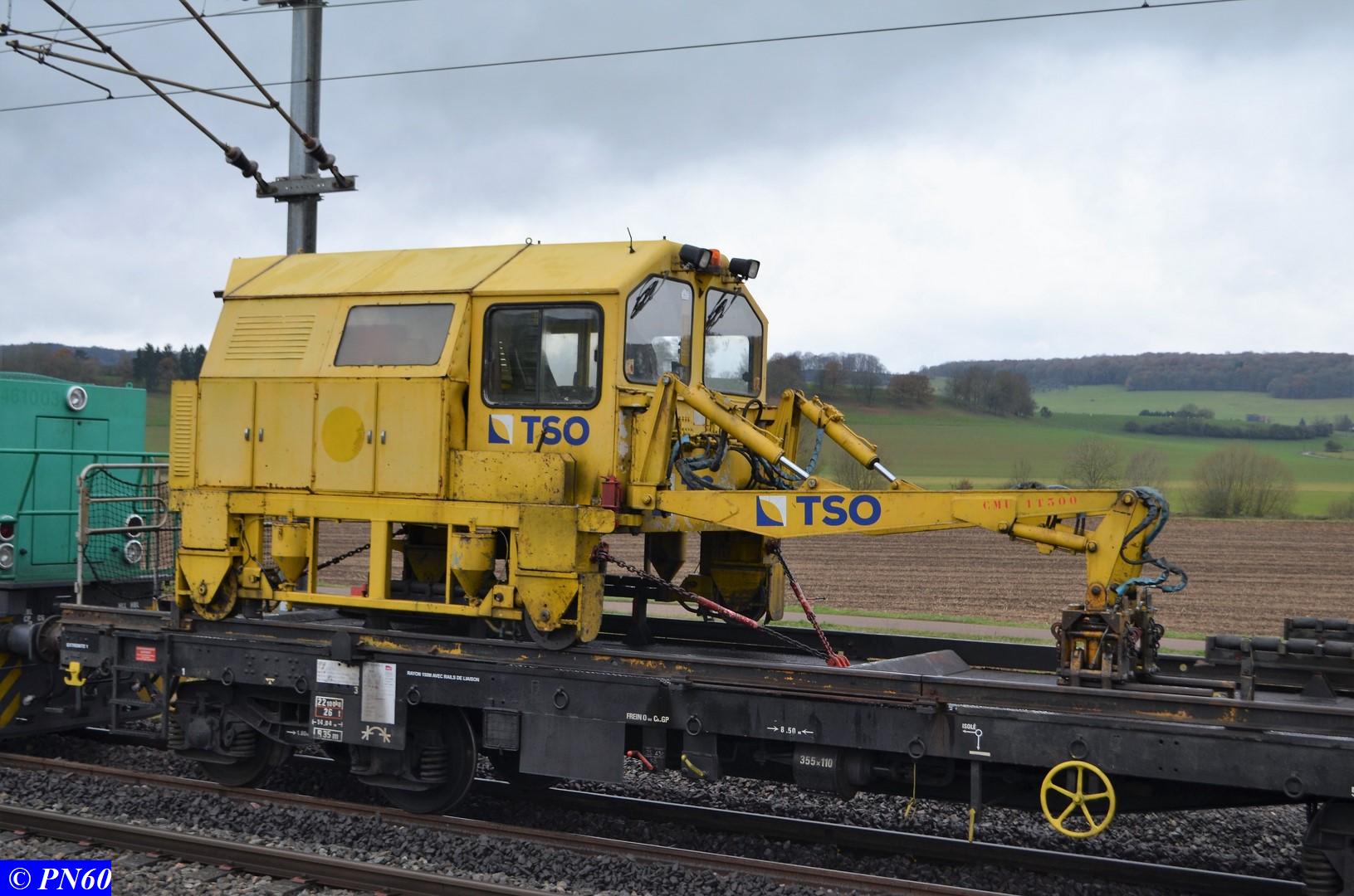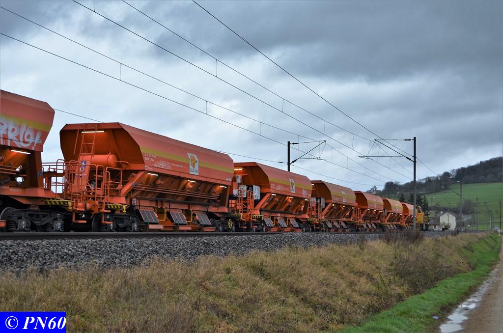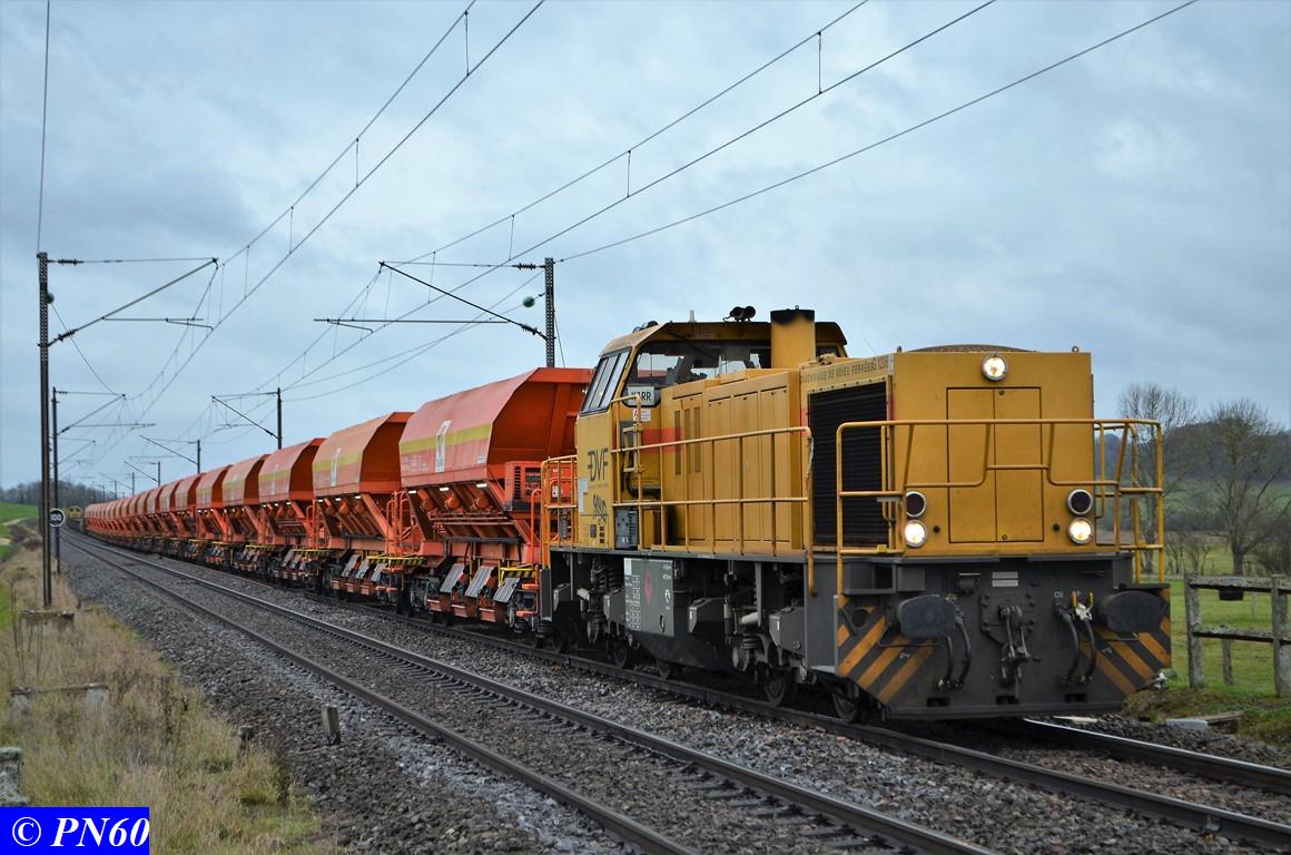 Ce dernier est tracté par la G.1206 n° 99 87 9 181 520-7 de la Dijonnaise de Voies Ferrées. Il est composé de ces fameux wagons à bogies orange Colas Rail équipés de néons.