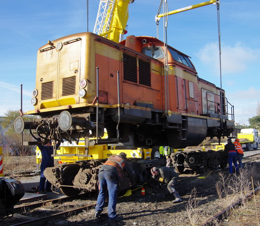 mise en place des bogies d'origine révisés après le soulèvement de la machine à Chaulnes le 06-03-2018
