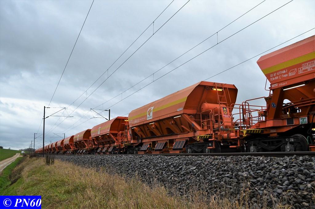 Dernières photos prises le 21 novembre 2017 : une pelleteuse sur rail officie au niveau du PN 60 - le train de coupe TSV 21 GP - 99 87 9 311 502-8 - Gipérail autonome en fonctionnement suivi d'un train de ballast avec ses wagons éclairés par des néons à la tombée du jour.
