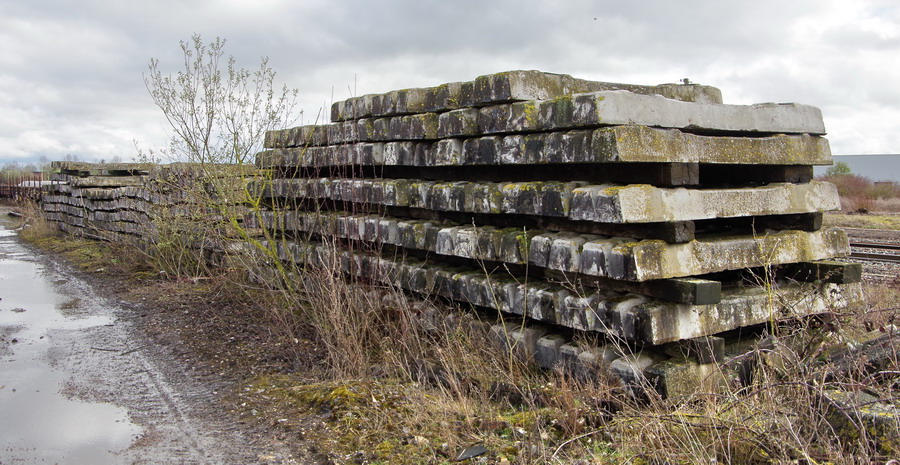 les traverses arrivent par train sur des wagons plats de type R90 puis déchargées et stockées sur la base de travaux
