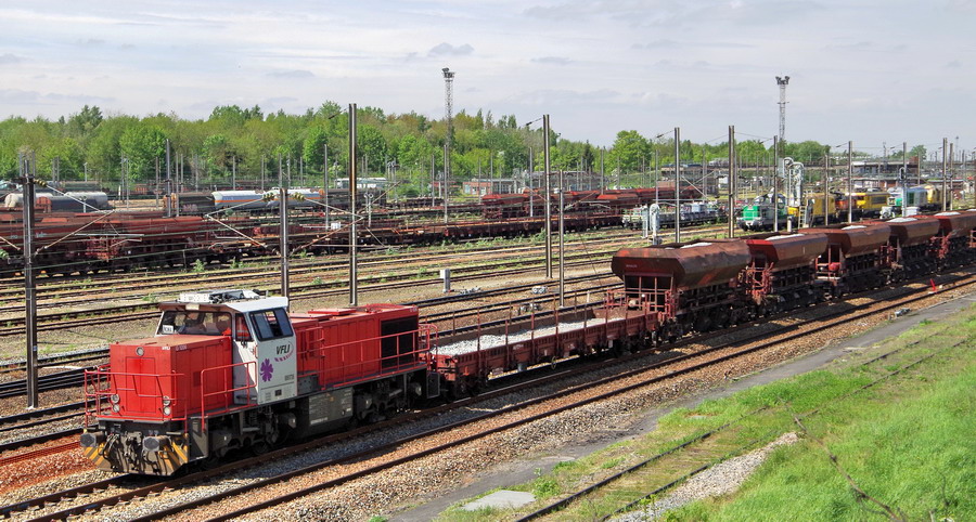 la voici le 02 mai 2018 à Tergnier (02) de passage sur un train de TTX n°K3K4 avec des trémies D12 de ballast
