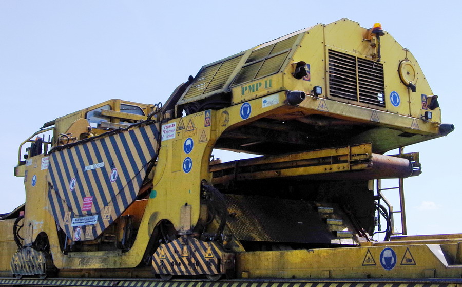 . wagon 5 WF - force avec poutre : évacuation du ballast, enlèvement des anciens rails et pose de nouveaux longs rails soudés