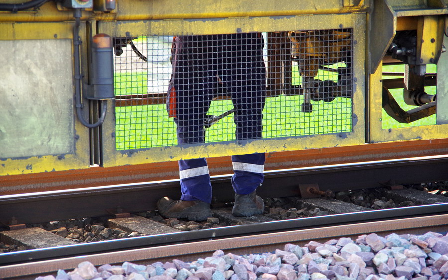 Wagon 5 - Wagon WF (Wagon force avec poutre : évacuation du ballast, enlèvement des anciens rails et pose de nouveaux longs rails soudés) en action