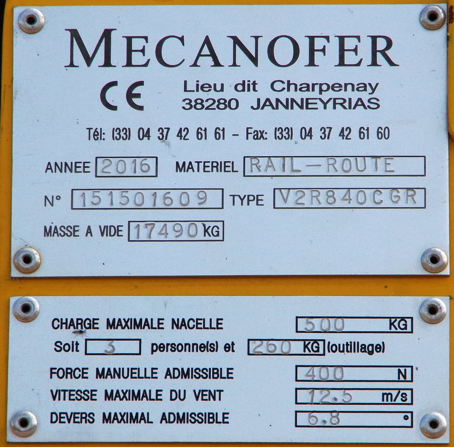 et avec une nacelle élévatrice Mecanofer de type V2R 840 C-GR n°151501609