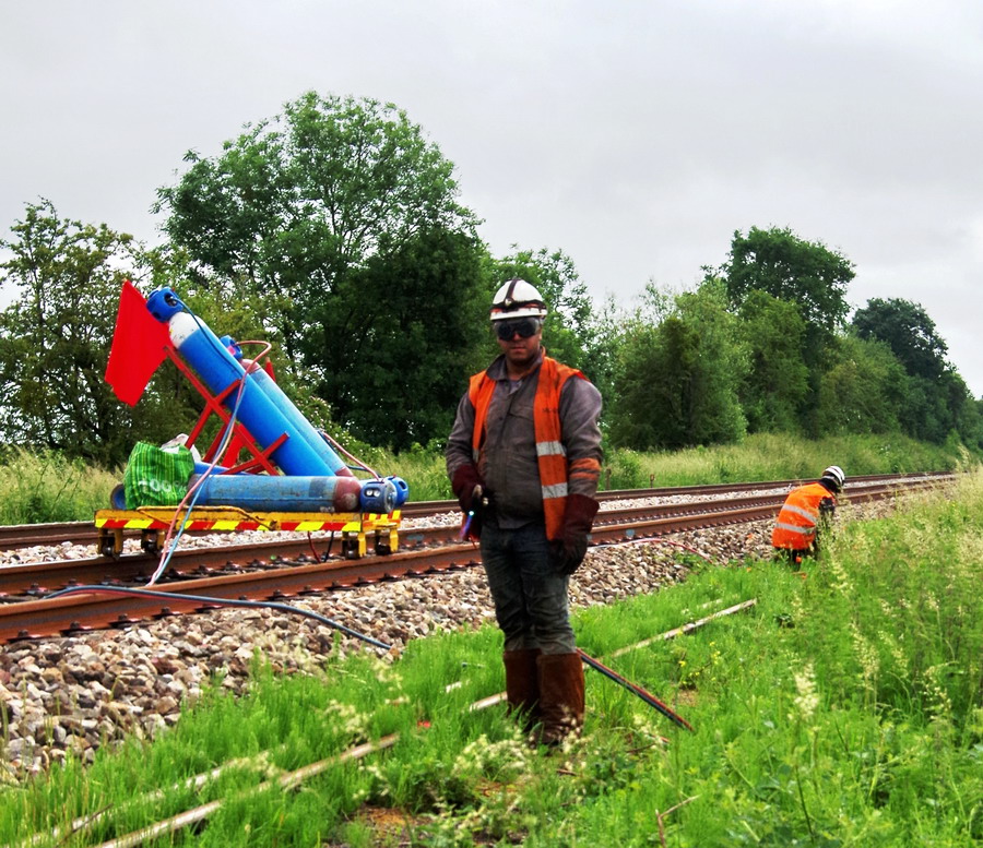 suite du reportage de Gtr Lefèvre entre la gare de Jussy et les ponts de Bray (02) pour une séance de coupage de coupon de rail de 18 m avec un chalumeau coupeur oxygène + acétylène par une équipe de Meccoli avec SNCF Réseau