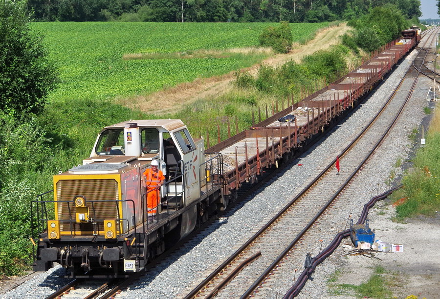 Photo de Gtr Lefèvre le 12 juin 2018 au niveau du pont de Bray à Jussy (02) de retour du RVB pour la basse de travaux de Laon avec le train n°F1F2 rame de finition et de ramassage de fin de chantier