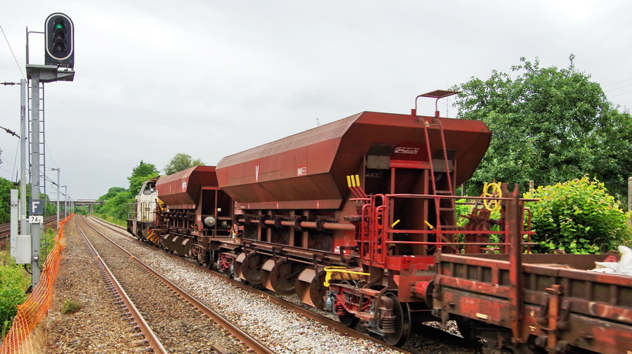 queue du train n°F1F2 de finition et de fin de chantier avec la G 1206 BB 5702080 - 92 87 0 002 080-5 F-ETF aux ponts de Bray à Jussy le 12-06-2018