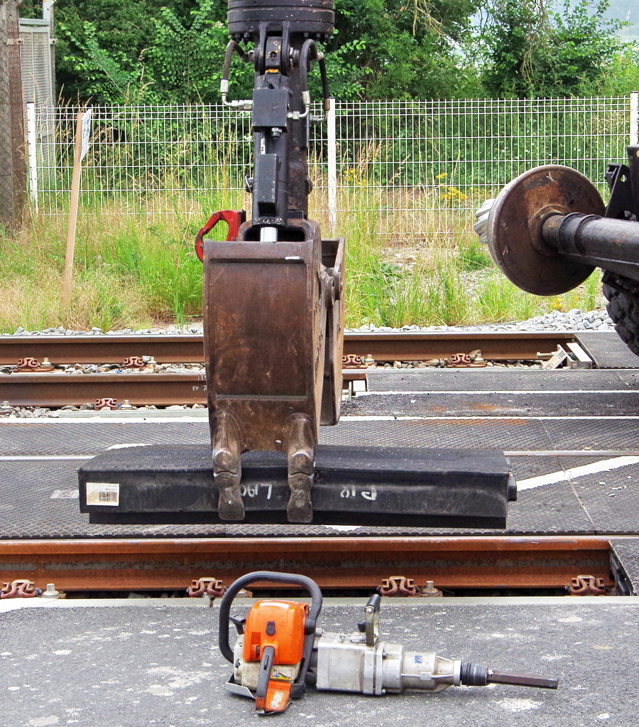 remise en place des plaques STRAIL avec un godet avec 3 crochets au PN n°36 d'Eppeville le 11-06-2018