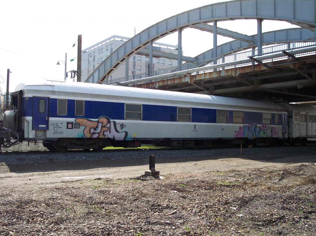 voici la voiture de cantonnement du train désherbeur vu au pied du PRS de Culoz sur une voie du faisceaux équipement