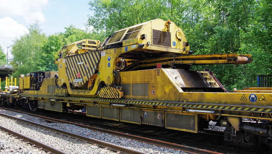 le wagon 4 WM - de manutention et groupe de travail avec chaîne de dégarnissage, dépose et pose de traverses