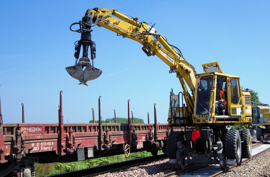 Pelle Rail route Geismar KGT V n°4716 - Meccoli A pour le ramassage des coupons de rail de 18 m à Blangy-Tronville le 27-06-2018