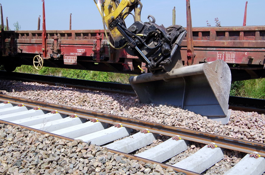 Pelle Rail route UNAC 22 TRR n°H9A00145 - Néoloc 1 (RR2) pour le ramassage des coupons de rail de 18 m à Blangy-Tronville le 27-06-2018