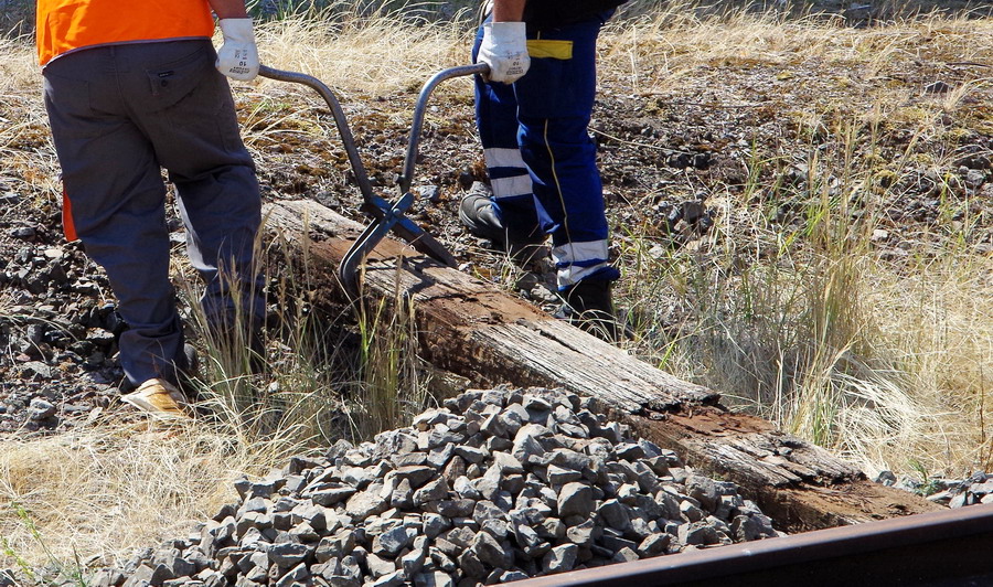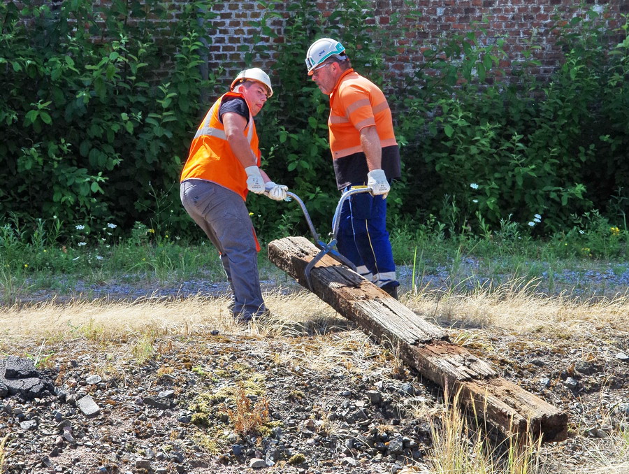 utilisation d'une Tenaille à traverses bois pour retirer la vieille traverse en gare de Marle-sur-Serre PK 164,043
