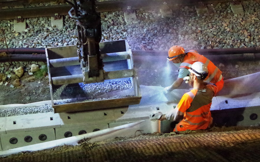 nuit du 26 au 27 juillet 2018 avec le travail pour l'installation des caniveaux par Colas Rail au niveau des ponts de Bray à