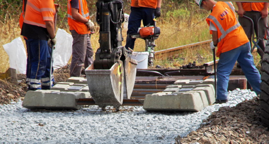 mise en place des novelles traverses en bois à la jonction de l'ancienne et de la nouvelle voie au niveau du PN n°92