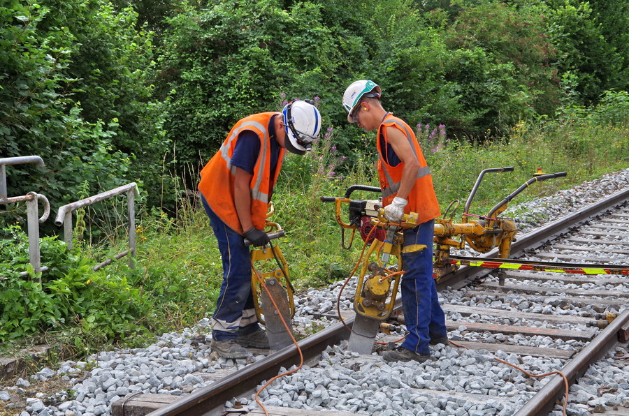 travail sur le pont ferroviaire avec un groupe de bourrage électrique Robel de type 62-04 à Rogny (02)
