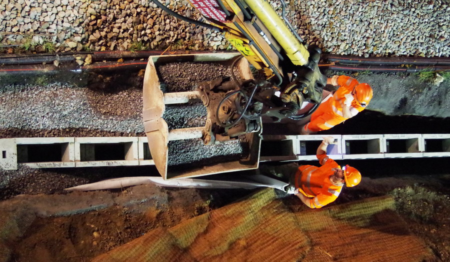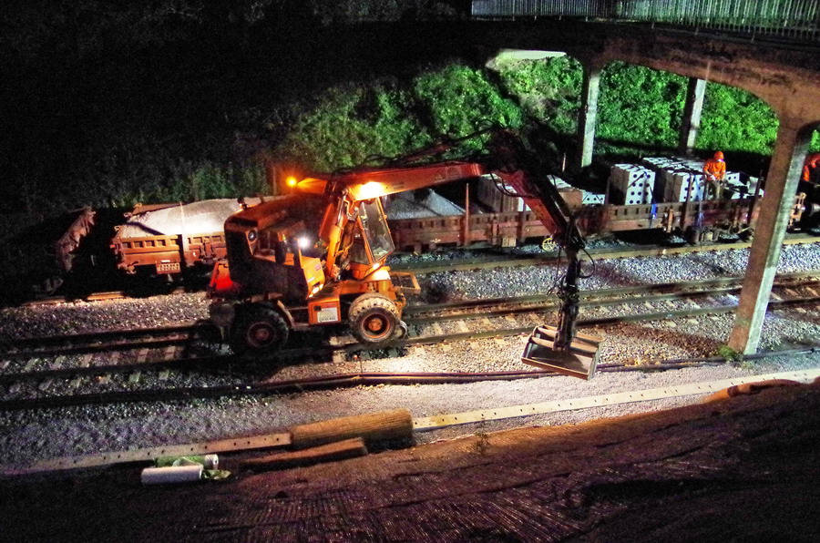 avec la présence des deux Pelles Rail route Colas Rail pour les travaux de caniveau