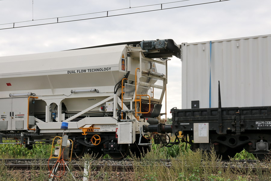 wagon plat de protection R90 - 99 87 9 383 779-5 avec petit container blanc ouvert pour le tapis des Double flux ETF
