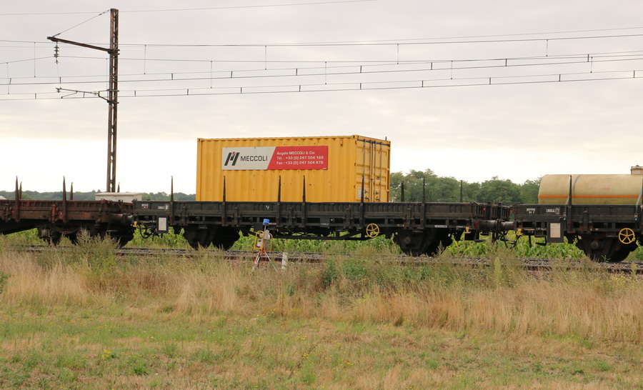 wagon plat K50 - 99 87 9 383 628-4 Meccoli (porte container jaune) à Limeray le 21-08-2018