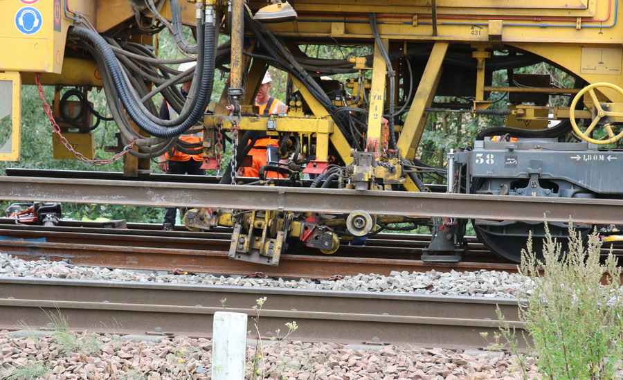 . wagon 5 WF - force avec poutre : évacuation du ballast, enlèvement des anciens rails et pose de nouveaux longs rails soudés