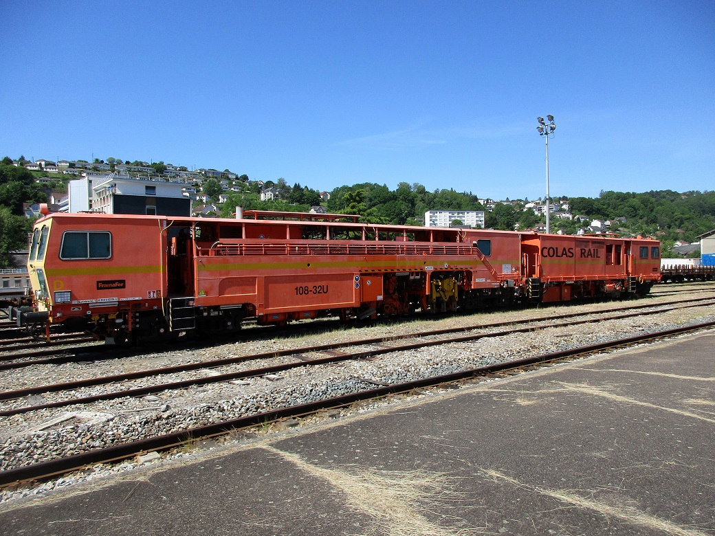 Egalement en attente sur une autre voie, mais sans aucune loc en tête, une rame de wagons trémie à bogies ainsi que la bourreuse 108-32 U n° 3499 de Colas Rail seule sur une troisième voie :