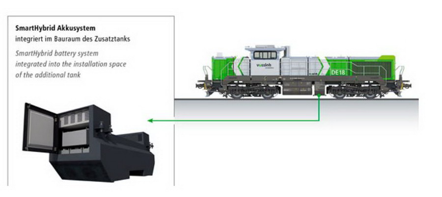 Vossloh Locomotives répond à cette demande avec l'offre de sa DE 18, qui est devenue la locomotive SmartHybrid, qui complète le moteur diesel de 1800 kW avec une batterie de 150 kWh, permettant aux opérateurs de voyager dans les tunnels ou les tunnels En fonction du profil de charge, les opérations de hall ont plus d'une heure d'opération de manœuvre sans émissions. La prise en charge étendue du démarrage et de l'arrêt du moteur diesel entraîne des réductions supplémentaires des émissions et permet de réaliser des économies efficaces sur les coûts de carburant et de maintenance.