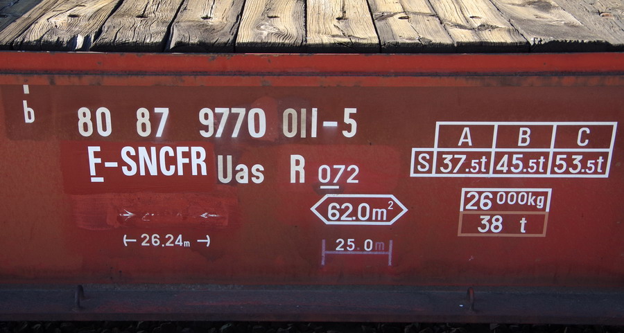 Voici le wagon plat 80 87 977 0 011-5 Uas R 07 2 F-SNCFR - SNCF RESEAU Point d'attache Moulin Neuf