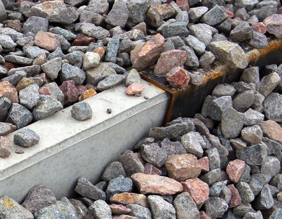 manutention (chargeur à tapis) du ballast par récupération des cailloux par le dessous et dépose directe dans des semi-remorques.