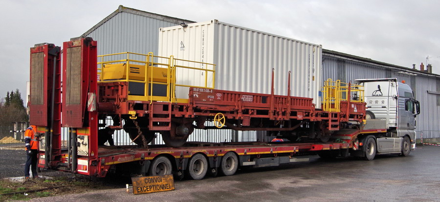arrivée de St Nazaire par camion du wagon pour la gare d'Origny-Sainte-Benoîte le 09 janvier 2019
