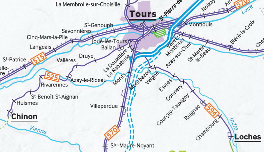Les gares entre Tours et Loches avec la bifurcation de la gare de Joué-lès-Tours pour Chinon