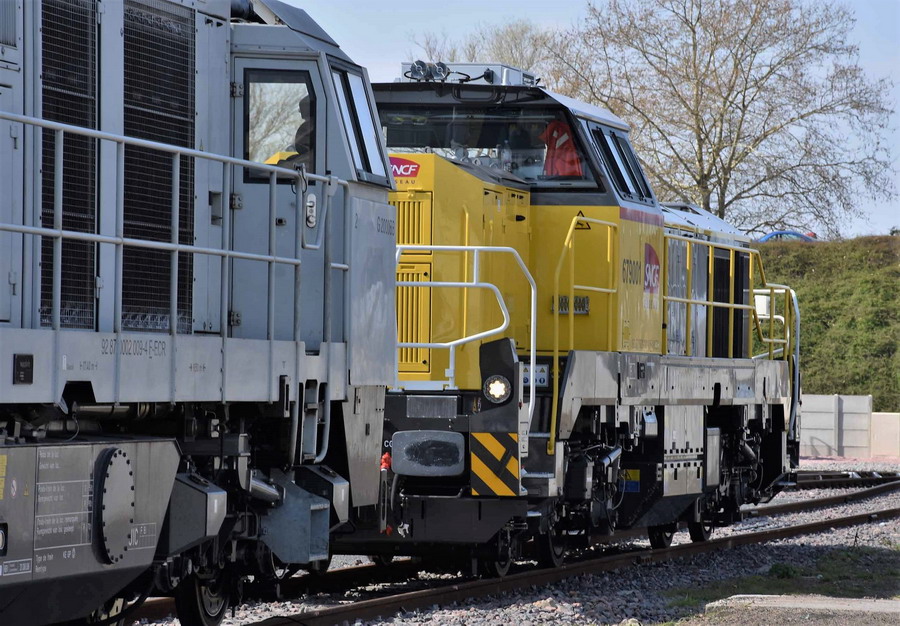 Nous pouvons voir le double marquage sur la cabine avec l'EVN n°92 87 0079 001-9 F-AKIEM et 679001 pour SNCF RESEAU