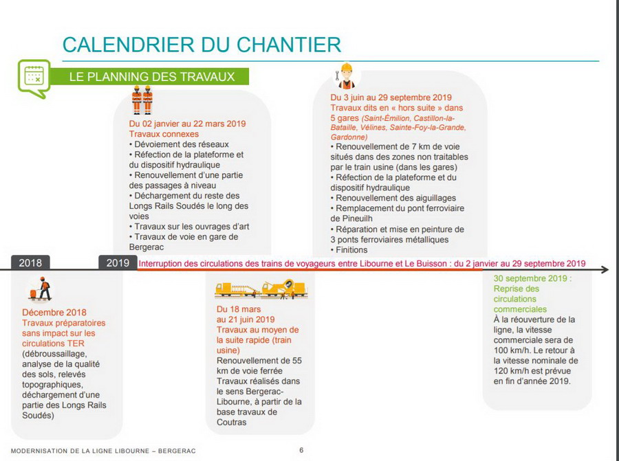 Afin d’assurer la pérennité de la section de ligne ferroviaire entre Libourne et Bergerac et de rétablir les performances nominales de la ligne, d’importants travaux de renouvellement de la voie sont réalisés entre janvier et septembre 2019. Cette opération est rendue possible grâce à l’engagement de la Région Nouvelle-Aquitaine, de l’Etat et de 16 collectivités territoriales aux côtés de SNCF Réseau. L’ensemble des partenaires est fortement mobilisé pour pérenniser et fiabiliser la desserte ferroviaire de l’ensemble des villes situées sur la ligne Libourne – Bergerac – Sarlat.