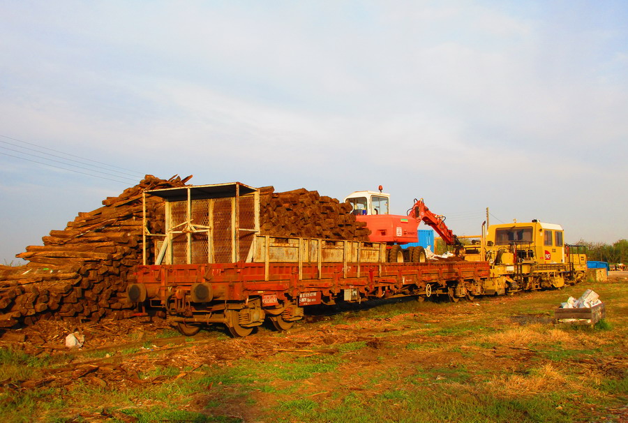 Le stock de traverses usagées + Bourreuse EMV 93 n° 99 87 9 228 019-5 SNCF-LM + 80 87 979 4 774-0 Uas R54 F-SNCF-LM