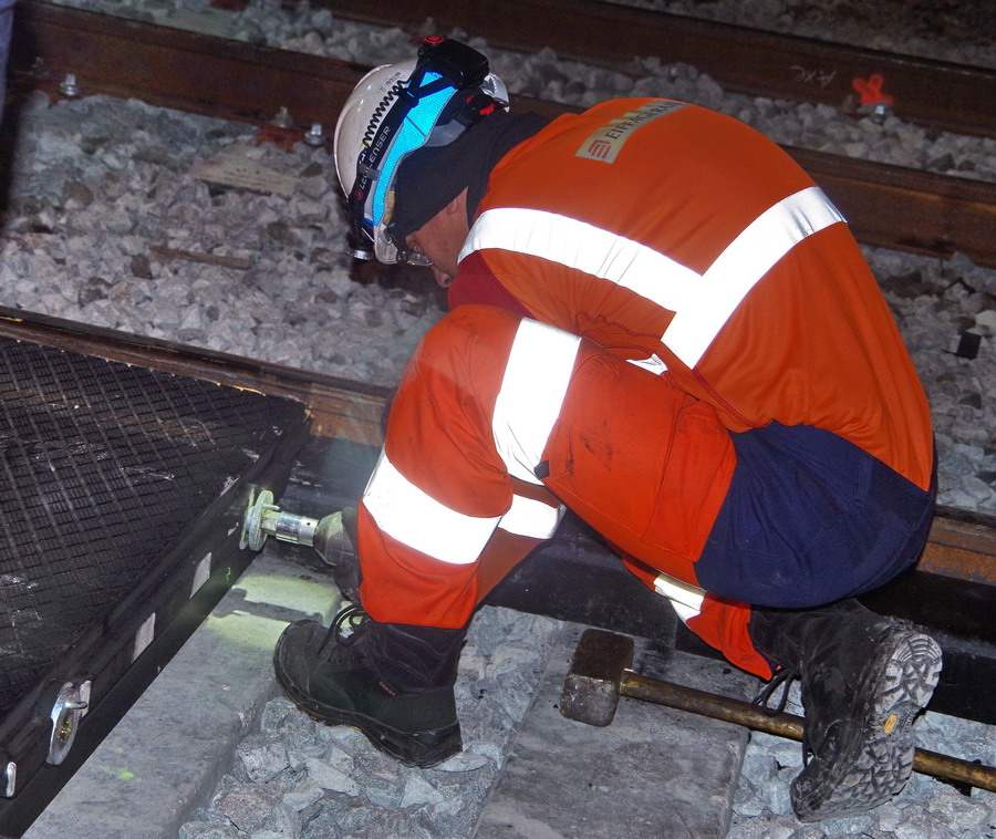montage des tiges de fixation de la première dalle STRAIL pour le PN 58 à Chauny nuit du 29 au 30-04-2019