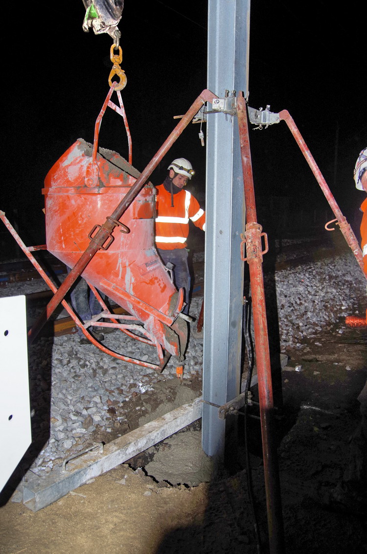 fixation du poteau de caténaire dans un trou de mâtage pour le coulage du béton prêt à l'emploi au PN 58 à Chauny nuit