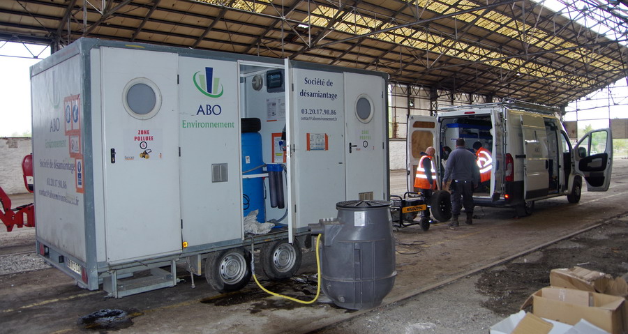 désamiantage du bâiment par ABO Environnement sur la Base de travaux arrière de Longueau le 07-05-2019