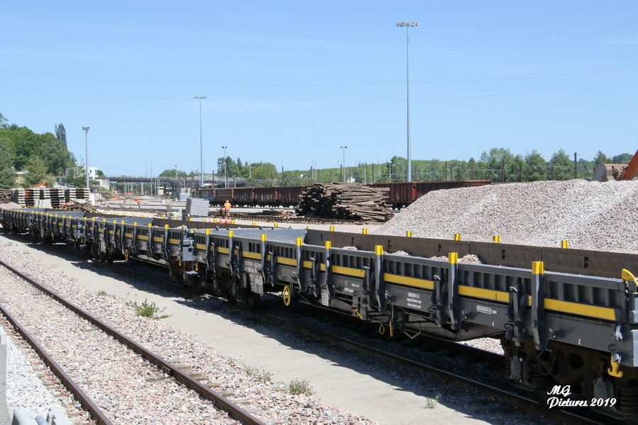 - une rame de wagons plates RES d'ERMEWA sur la nouvelle base arrière de l'ex triage du Puy-Imbert le 14-05-2019