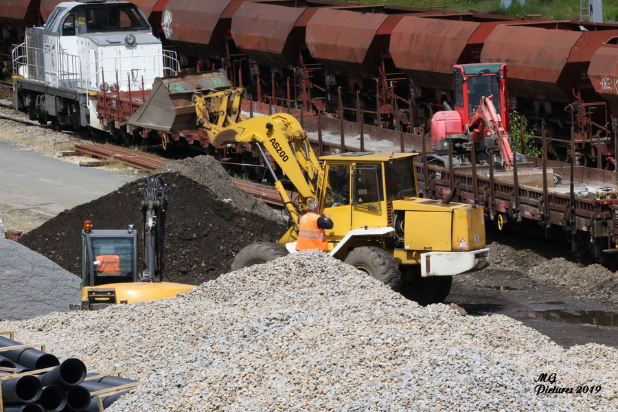 déchargement des déblais des wagons plats sur la base de travaux en gare de Limoges-Montjovis le 06-06-2019