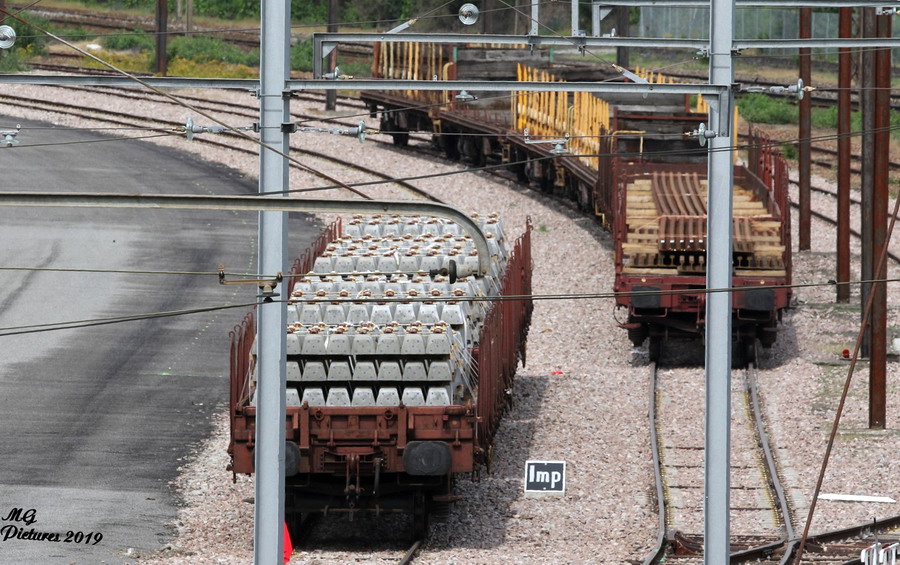 rame de wagons plats avec traverses béton sur la base de travaux du Puy-Imbert le 02-07-2019