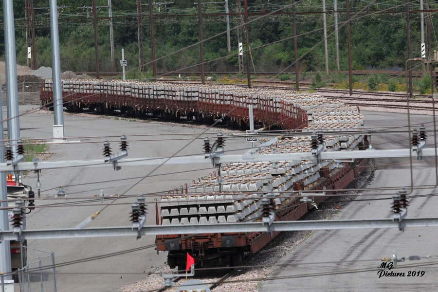 rame de wagons plats avec traverses béton sur la base de travaux du Puy-Imbert le 02-07-2019