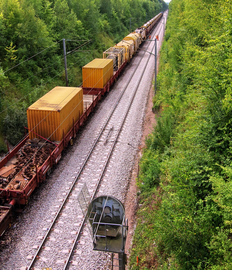 nous sommes maintenant au PK 33 avec le passage de la Dégarnisseuse C75 GCF Roma et la rame de Trémies pour le ballast