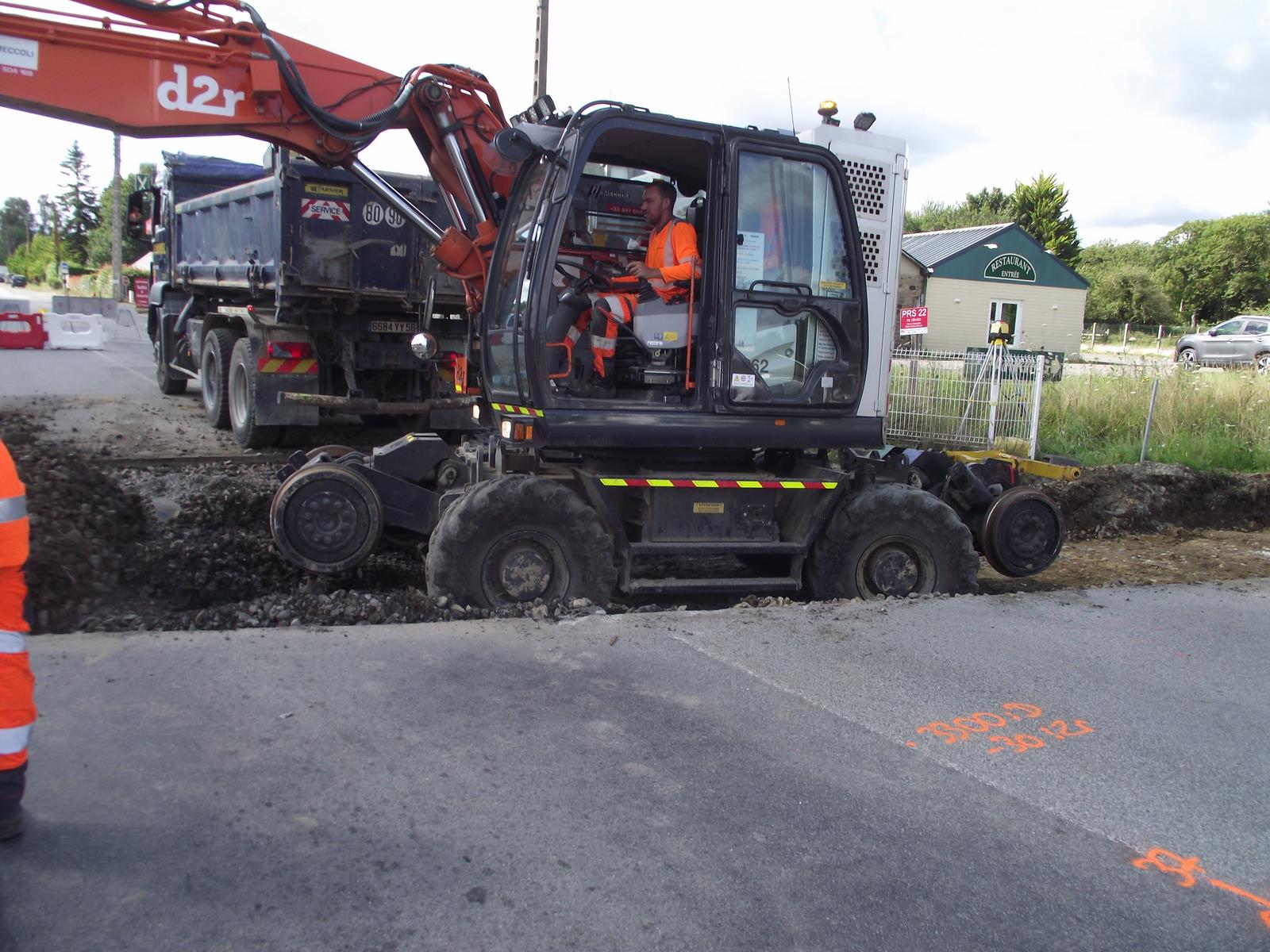 les travaux vont bon train!! Eiffage énergie system termine la pose des caniveaux dans la zone marais, Meccoli travaille sur les P.N.: dépose de l'ancien et pose du nouveau tronçon de voie et du platelage.