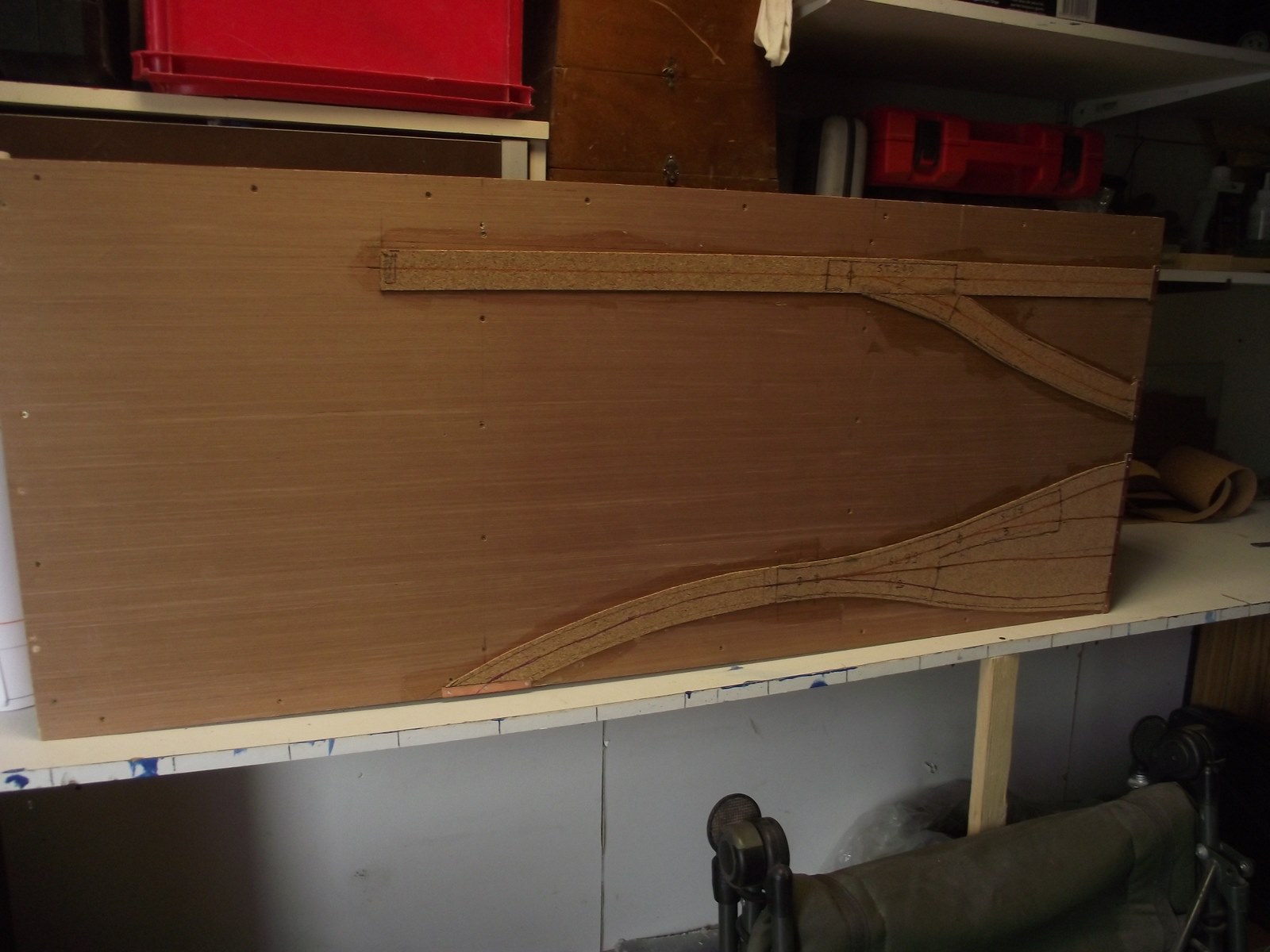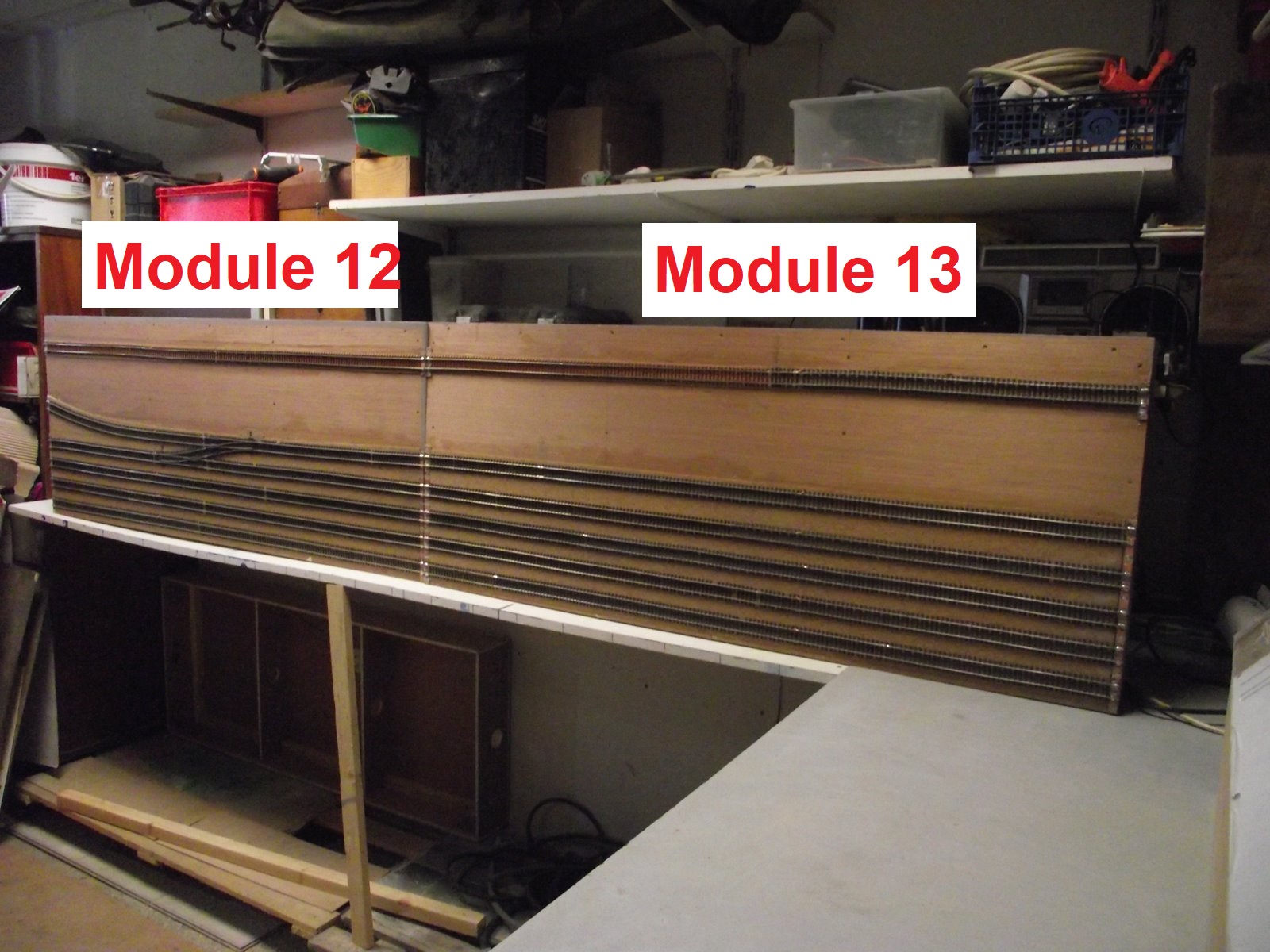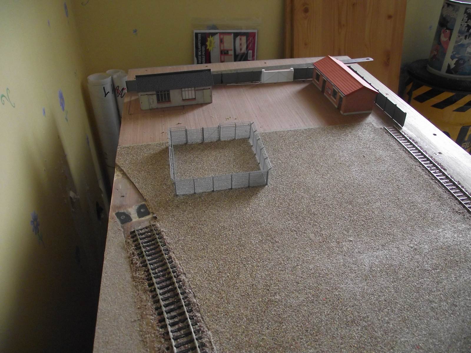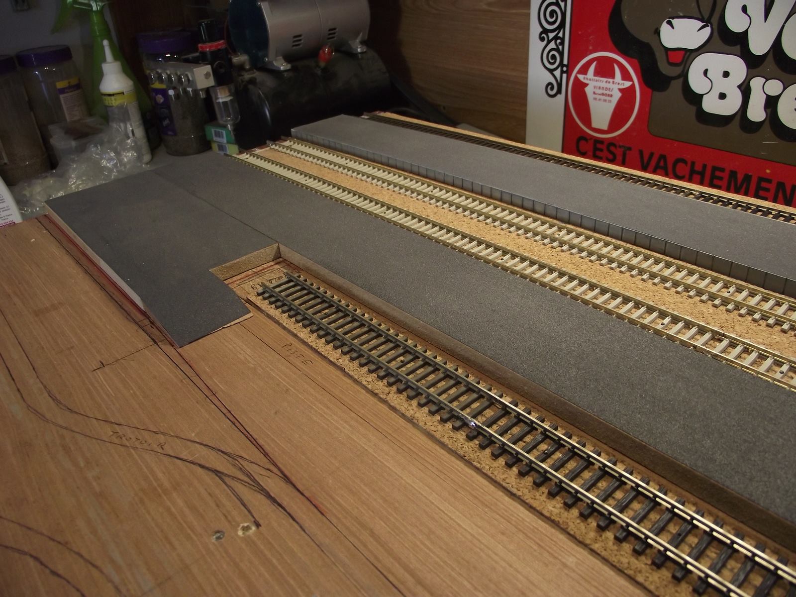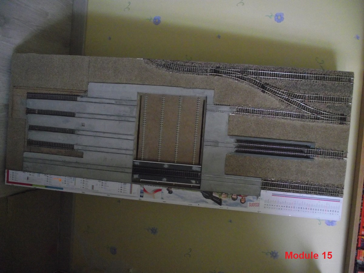 pour l'instant 10 modules (partie gare) sont assemblés sur les 17, les 5 modules de la partie voies de garage sont en cours de pose du liège