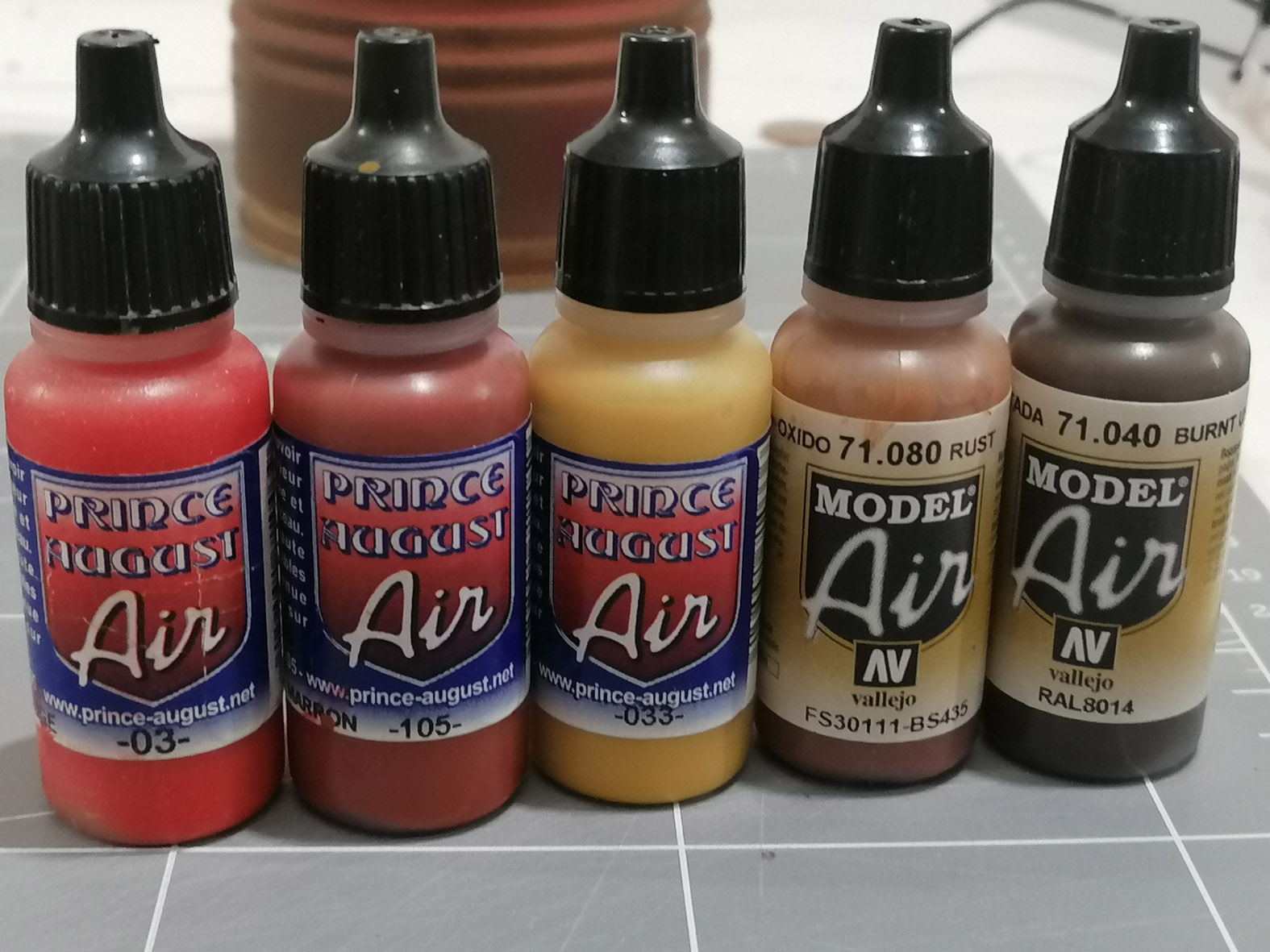 Je fais les mélanges dans une coupelle plus ou moins rouge ou marron suivant les parties. J'y ajoute un gris parfois pour désaturer. Ce que j'aime dans cette peinture c'est qu'elle se dilue dans l'eau. Je peux conserver les pots pendant des années alors que les humbrol sèchent rapidement si le pot est mal fermé.
