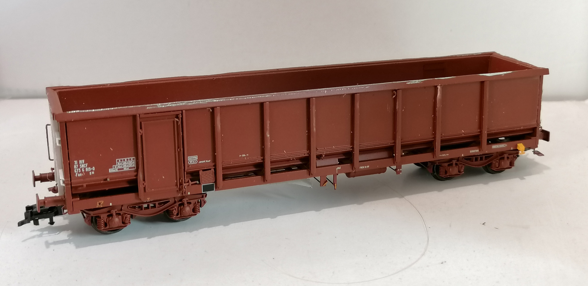 Les côtés du wagon tombereau E74 refait en platicard et avec des échelles SMD