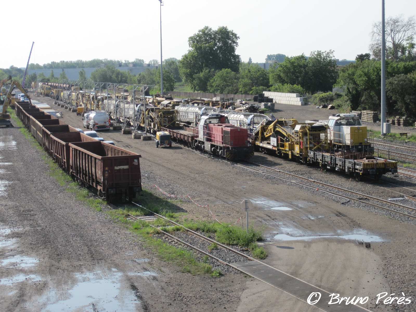 Sur la partie Sud se trouvent (sauf erreur de ma part) déchargement et chargement du ballast neuf, des traverses neuves, ainsi que l'entretien de certains matériels. On aperçoit au loin le TCM 60.