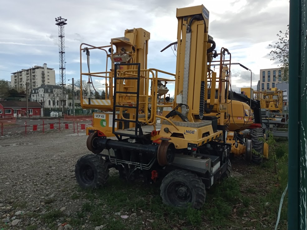Photos réalisées à Belfort le 11 et 12 Avril 2015, aux abords de la gare. J'ai pu voir cette semaine tôt le matin, cette machine en activité à l'entrée de la gare de Belfort, sur une zone ou des modifications, on eu lieu dont la suppression d'une voie.