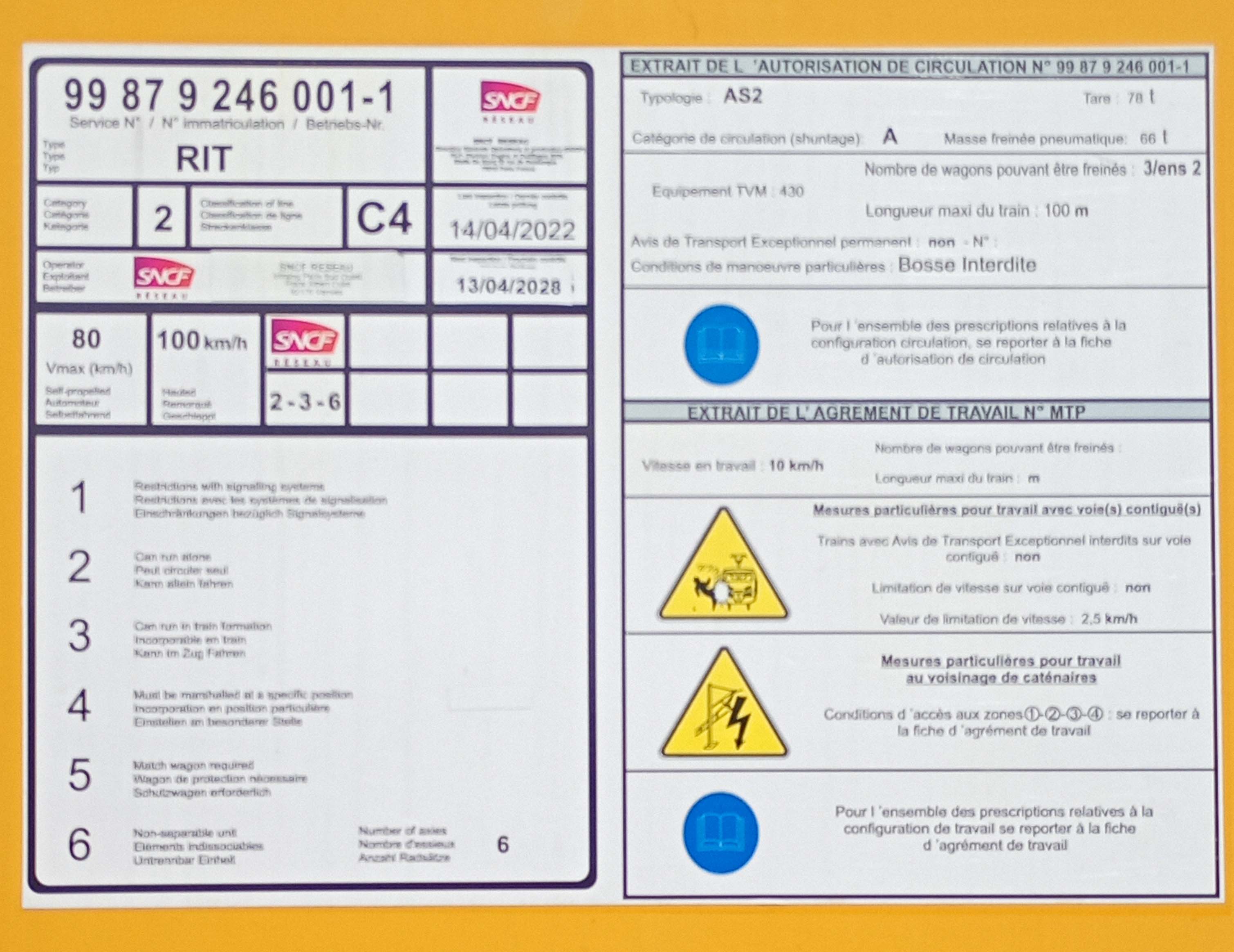 Agrément de travail MTP - 03-02-2016 / 03-02-2019 avec TVM 430 et Tare de 78T