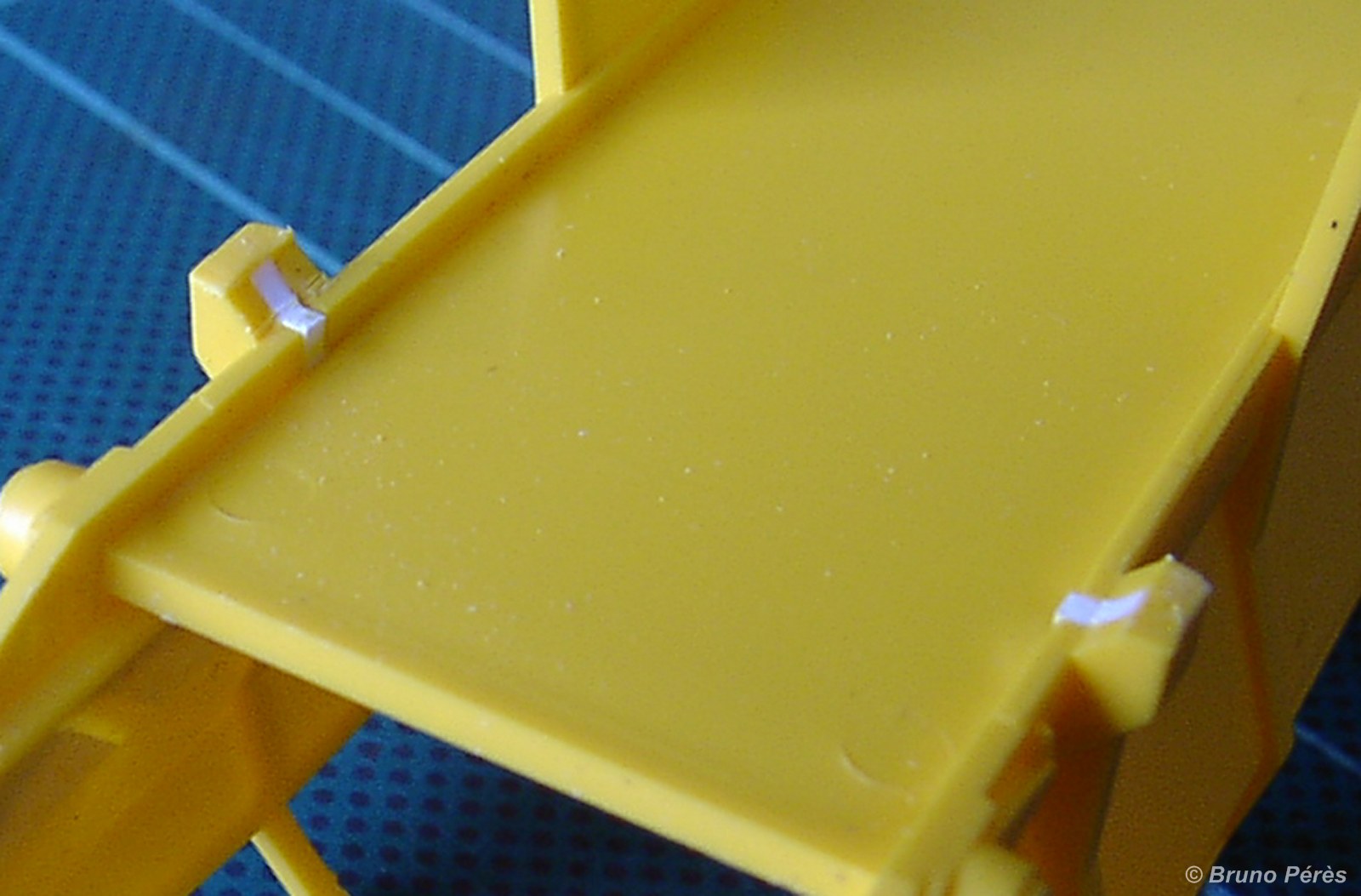 Donc, reprenons ! Il faut d'abord supprimer les pieds avant de la trémies. J'ai essayer de coller au plus près de la réalité en diminuant la largeur de la partie située juste sur le "plancher" de la trémie. Pour cela, j'ai découpé ces pieds juste au dessous de la partie biaisée. J'ai ensuite bouché les trous en collant un morceau de profilé Evergreen n° 144 (2 x 1) de 3,5 mm de long (sur les photos, il s'agit de deux morceaux de 1 x 1, ce qui revient au même !!!). Une fois le collage bien solide et sec, mettre le plastique à la forme du pied. L'ensemble ne doit plus mesurer que 1 mm de large (voir la 3ème photo).